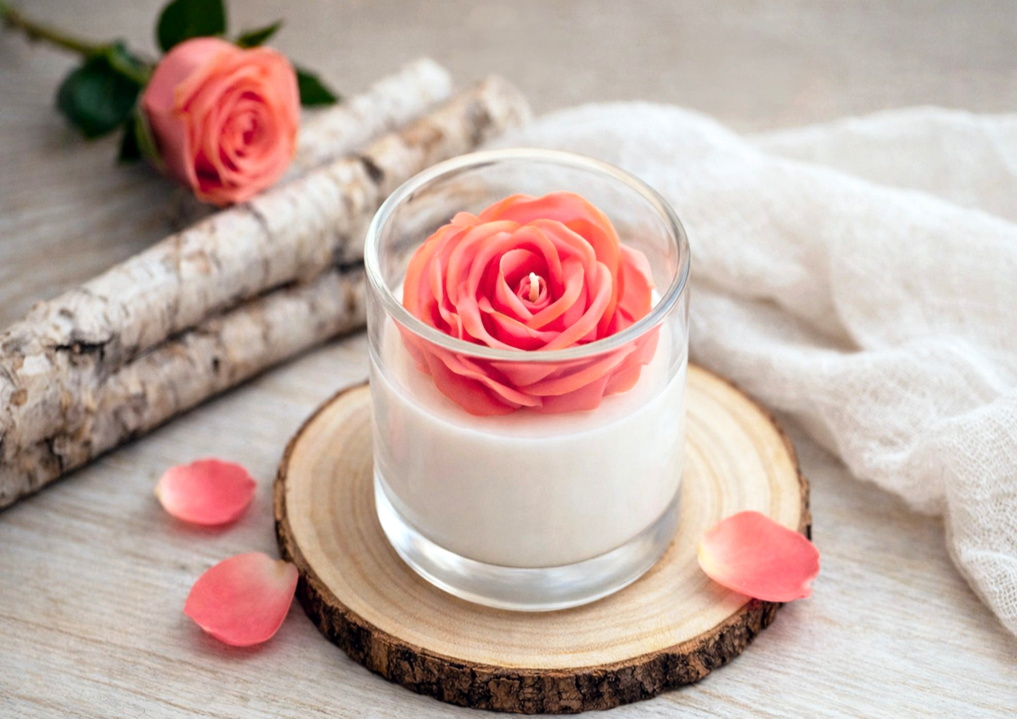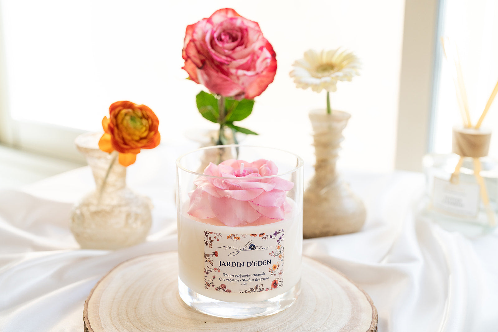 Bougie florale artisanale parfum de Grasse sur bois d’olivier